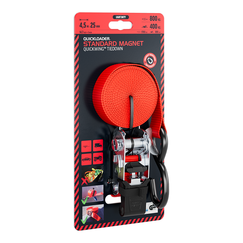 QUICKLOADER® Standard Hybrid QSD800LDH tie-down secures light duty cargo. The Magneat™ Neodymium Tidy Storage feature ensures clean storage and prevents slipping hooks with its hybrid magnet design.
